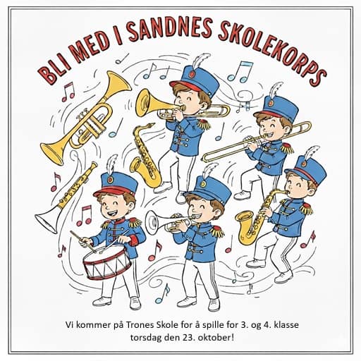 Torsdag den 23. oktober kommer noen utvalgte musikanter og vår flotte dirigent, Hanne Marthe, på besøk 3. og 4. klasse på Trones Skole. Der skal de spille litt for elevene, vise de forskjellige instrumentene og si litt om det å gå i korps.